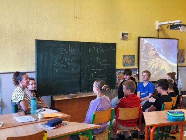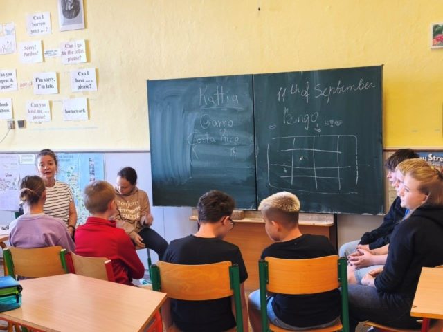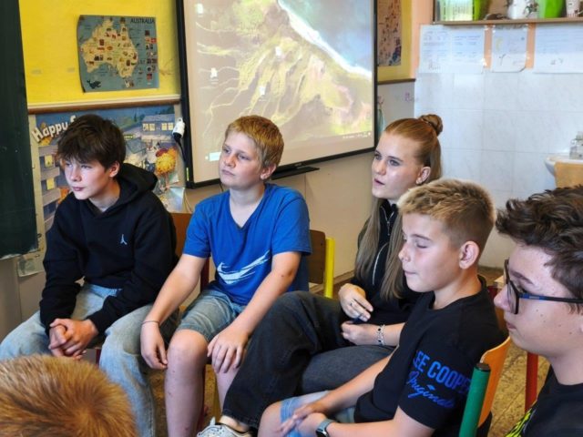 Také v letošním školním roce mají naši žáci možnost konverzovat s rodilou mluvčí anglického jazyka. Ve své vzdělávací misi pokračuje všemi oblíbená Katia. A jaká byla náplň první společné hodiny v sedmém ročníku? No přece vzpomínky na prázdniny🙂